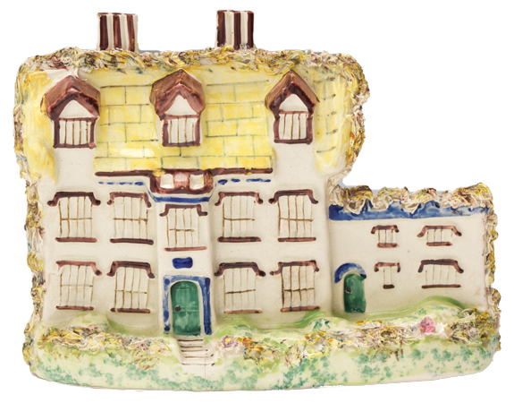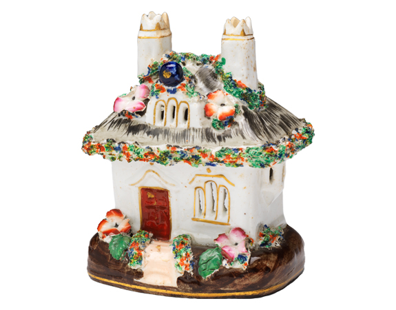 In the middle of the 1800s, veritable cities of little ceramic buildings appeared in British homes. Made by almost all the main Staffordshire potteries, in England’s West Midlands, and aimed at working- and middle-class customers, these cottages and castles fulfilled useful and ornamental functions. Perhaps sitting on mantels as decoration or used to hold pastille burners, much like incense burners, smoke would have slipped out of the miniature chimneys and windows, improving the aroma of Victorian homes. Some are floral-embellished cottages from a romanticized rural life, and others represent castles and buildings of the time. A few depict “murder houses” where actual crimes were committed. These charming and occasionally odd period pieces can remind us that the smallest and most seemingly innocuous objects can tell powerful stories about history and culture.
